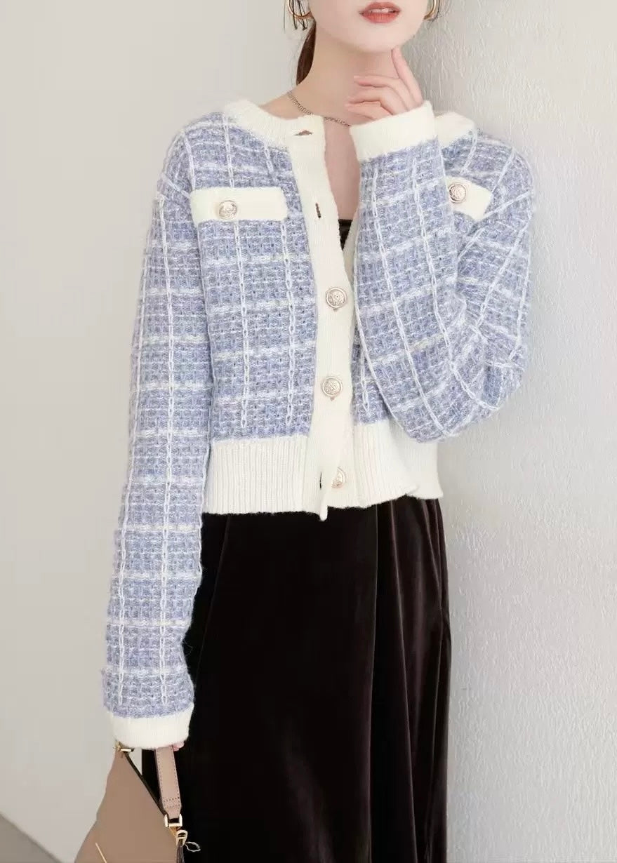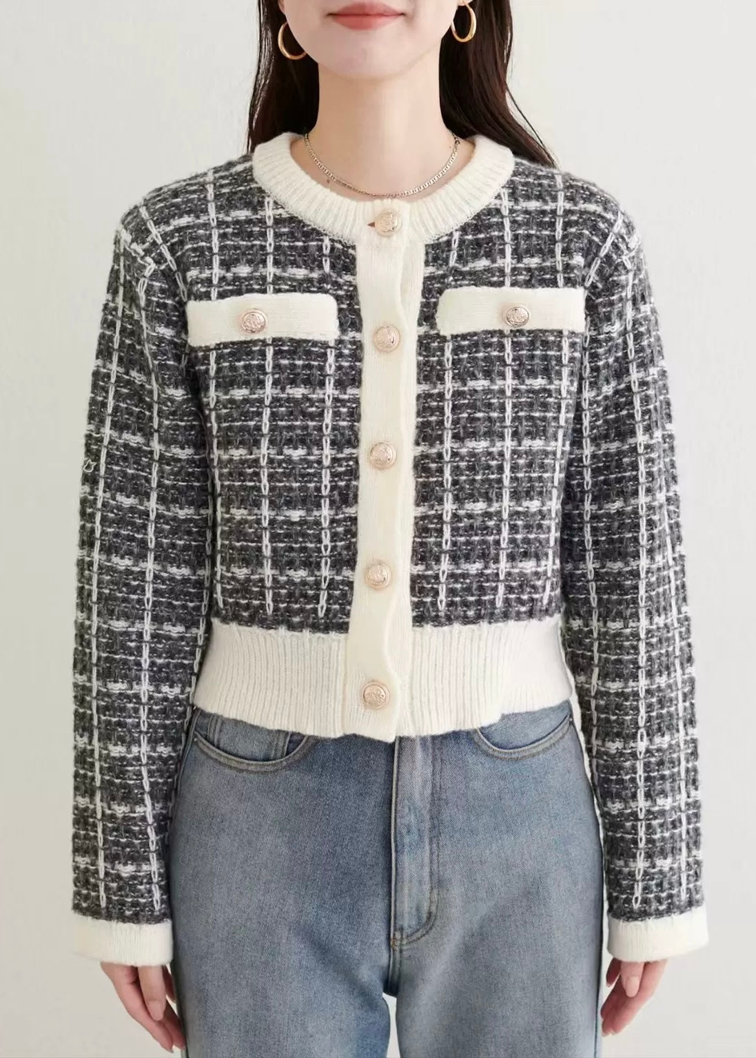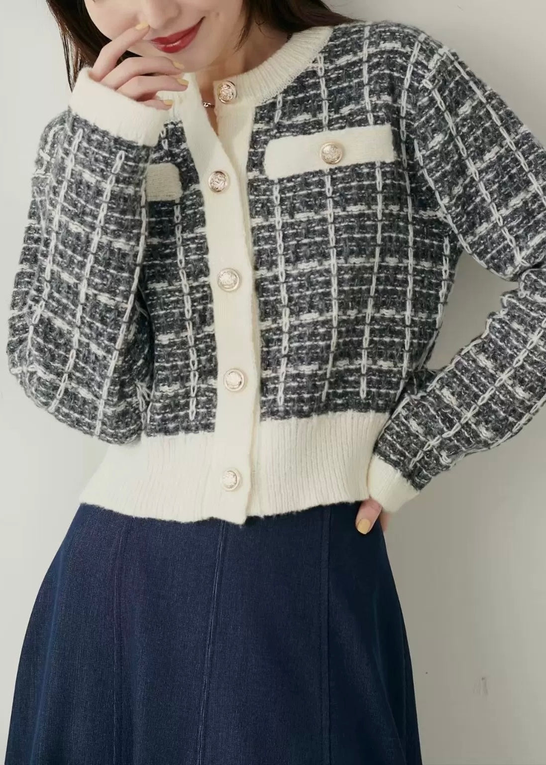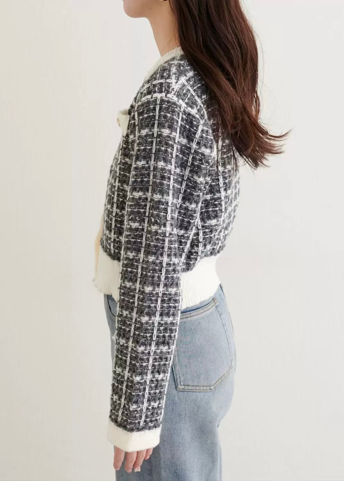 ツイード調の編地とパールボタンが上品な印象を添えるショートカーディガン。
