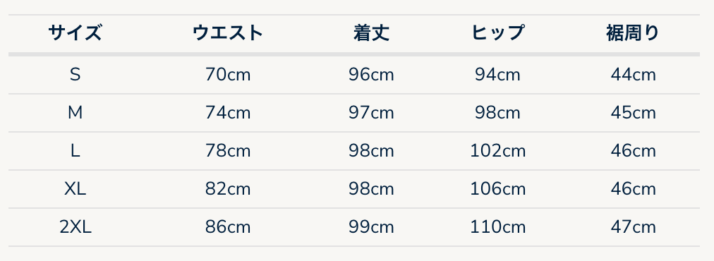 サイズ | ウエスト | 着丈 | ヒップ | 裾周り |