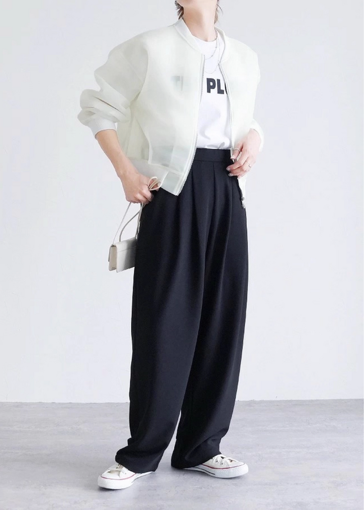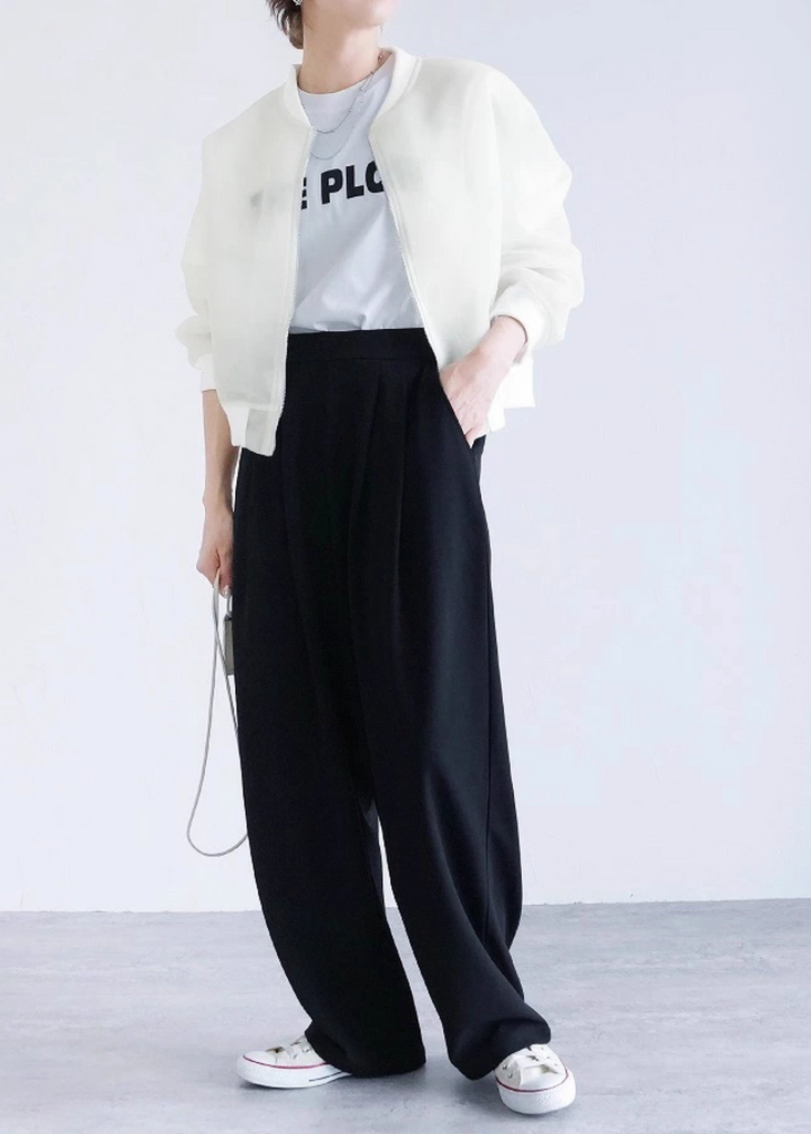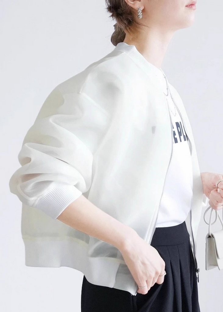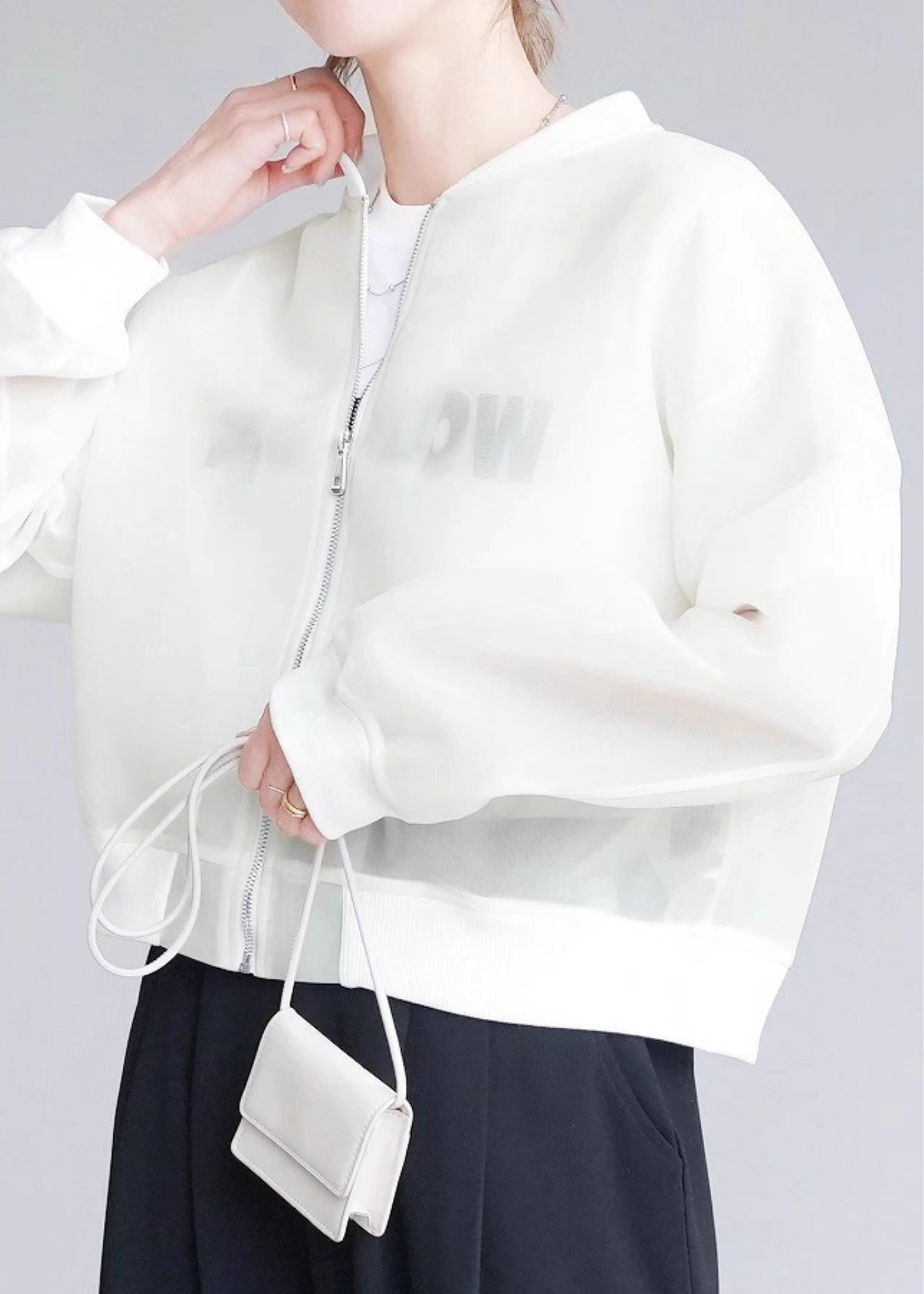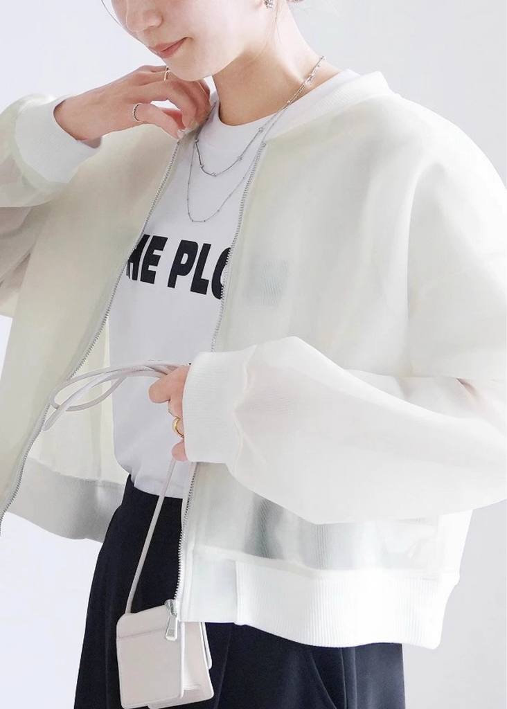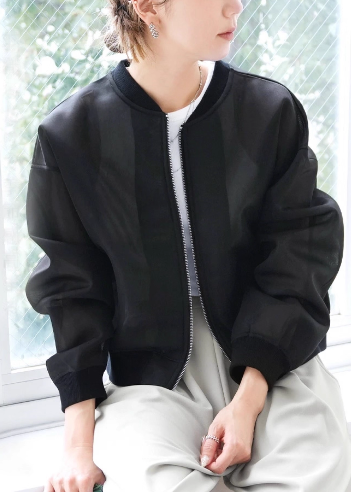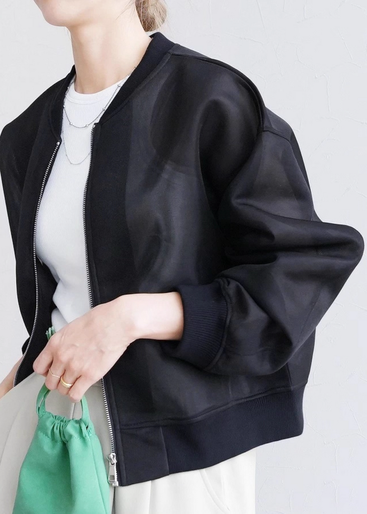 ほんのり透け感のあるシアー素材が、軽やかで都会的な印象のブルゾン。