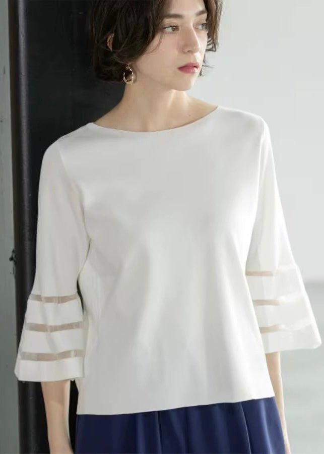 広がりすぎないフレアスリーブが手元を美しく演出し、シンプルながらも女性らしさをプラス。
