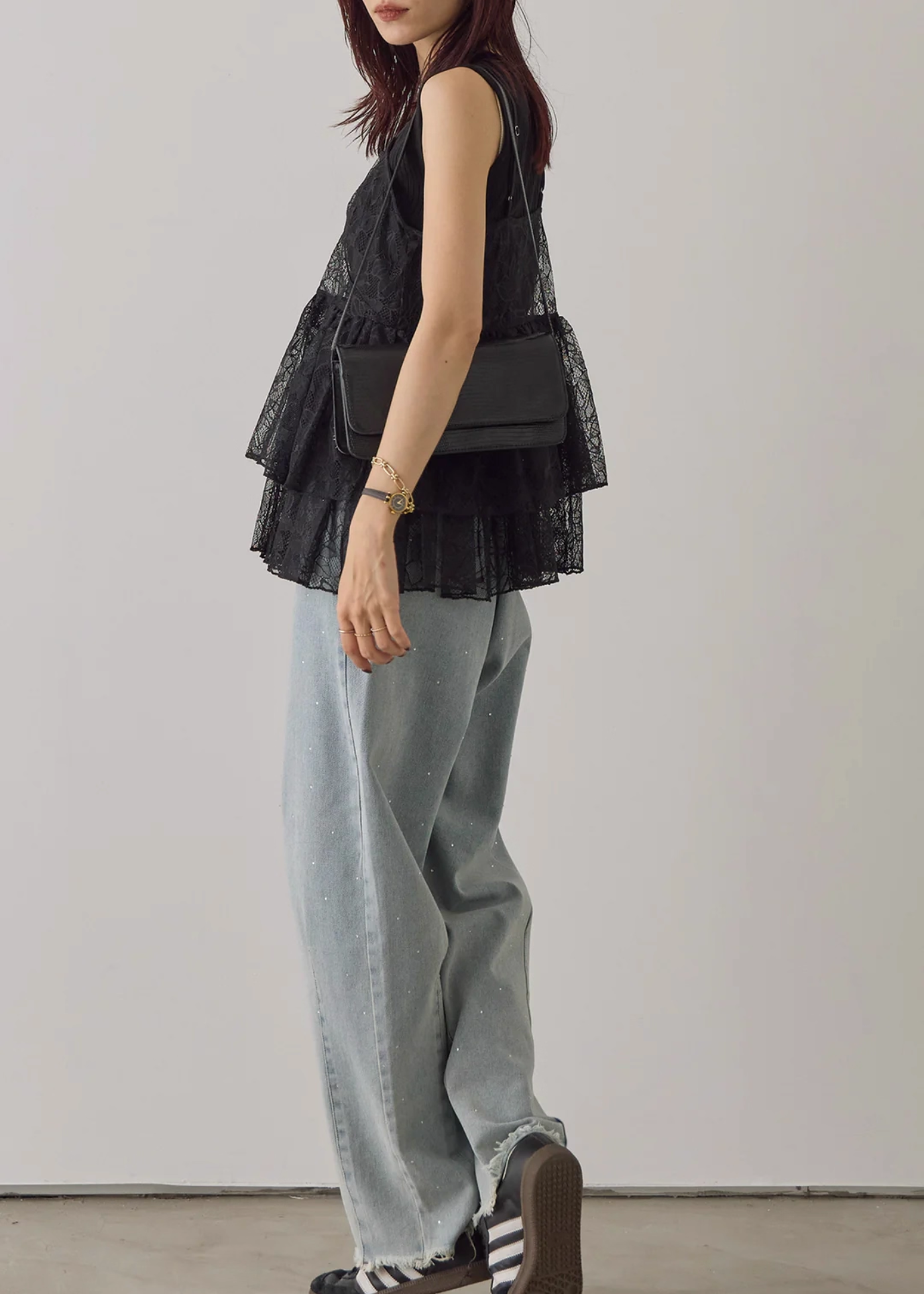 立体感のあるフラワーレースとティアードデザインが、動くたびに揺れて華やかな印象に。