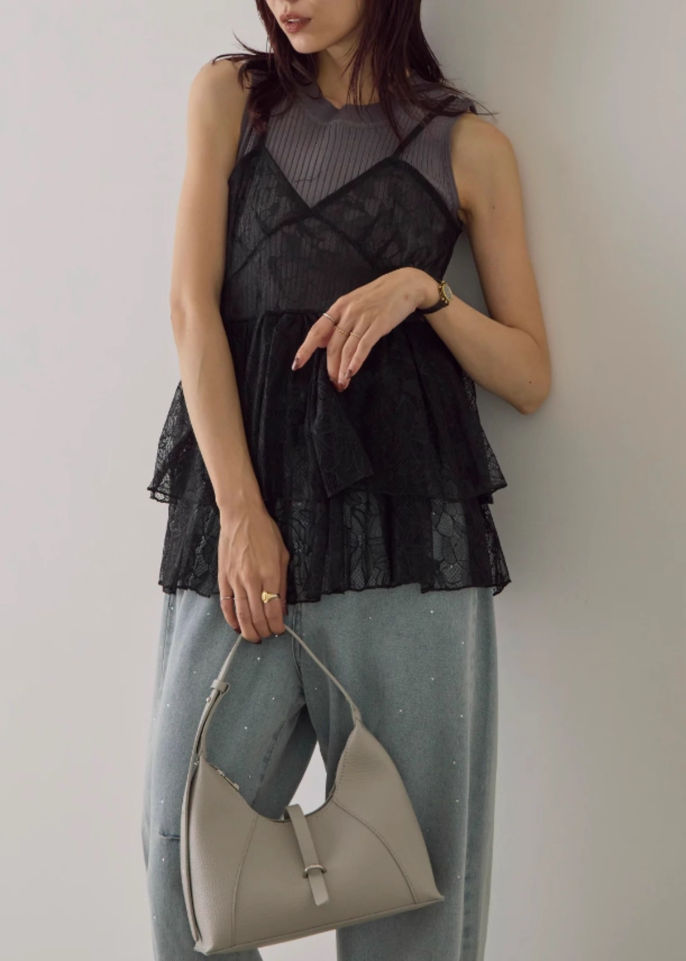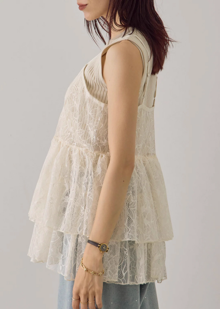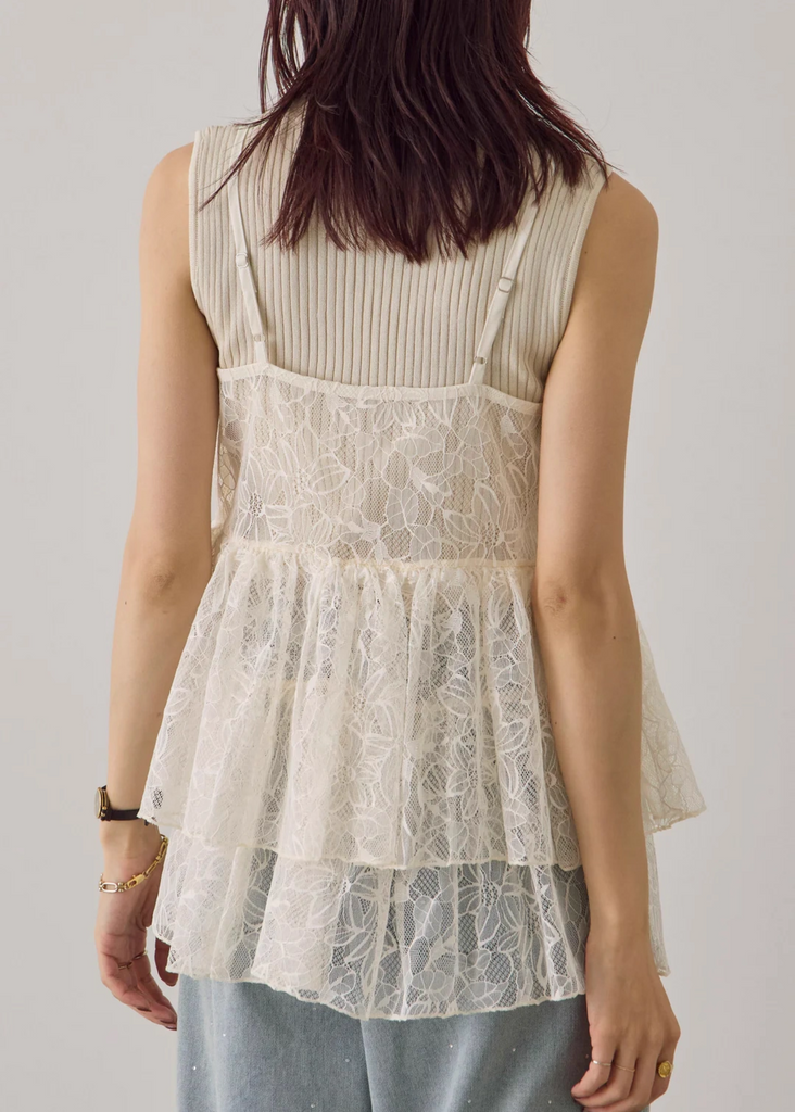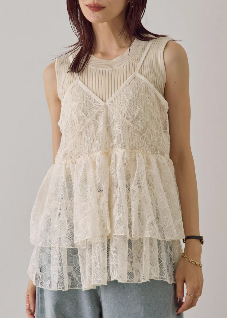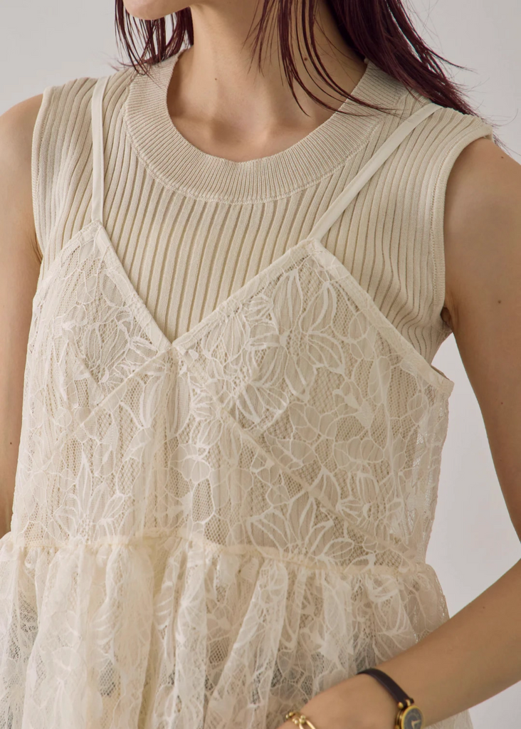 フェミニンなレースキャミと、ヘルシーなノースリーブリブニットのレイヤードセット。