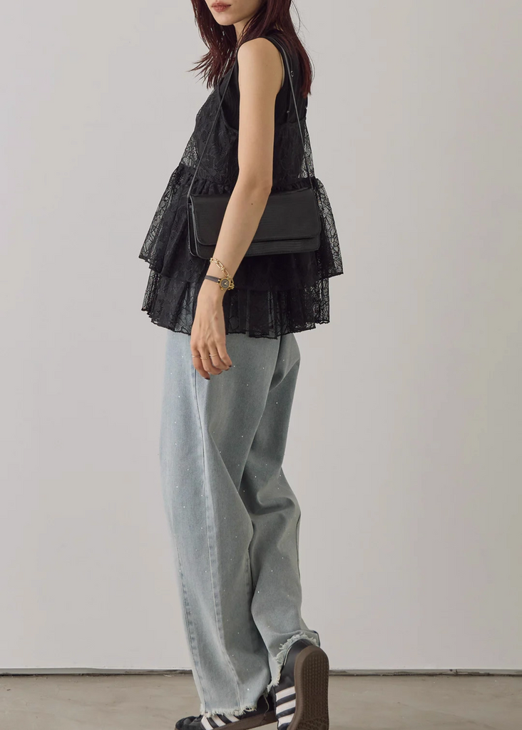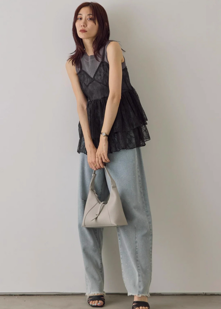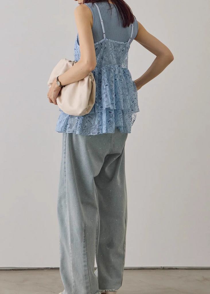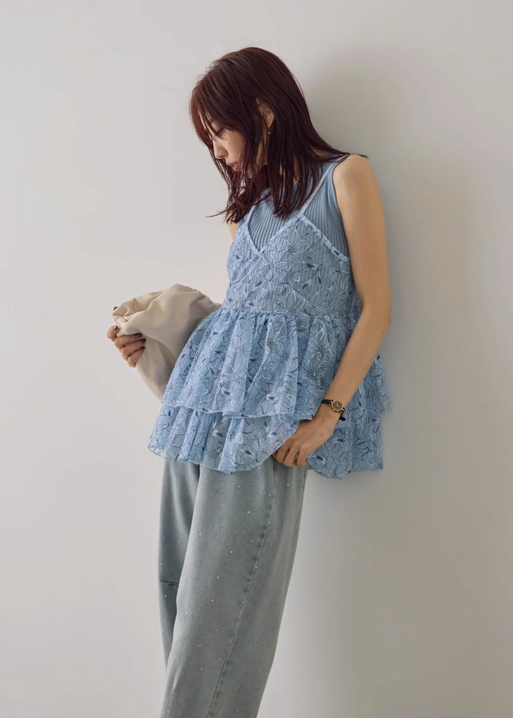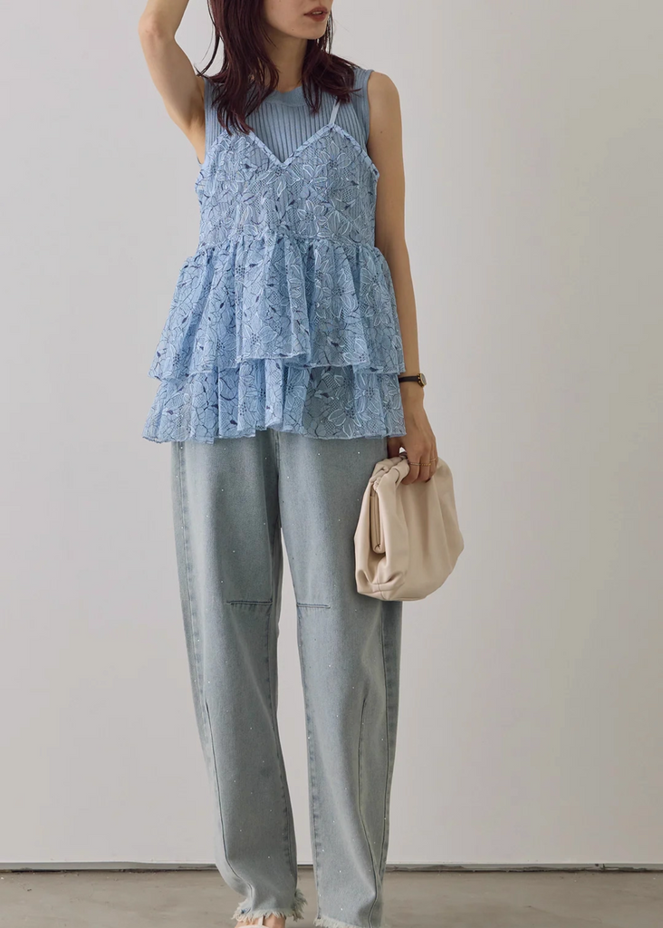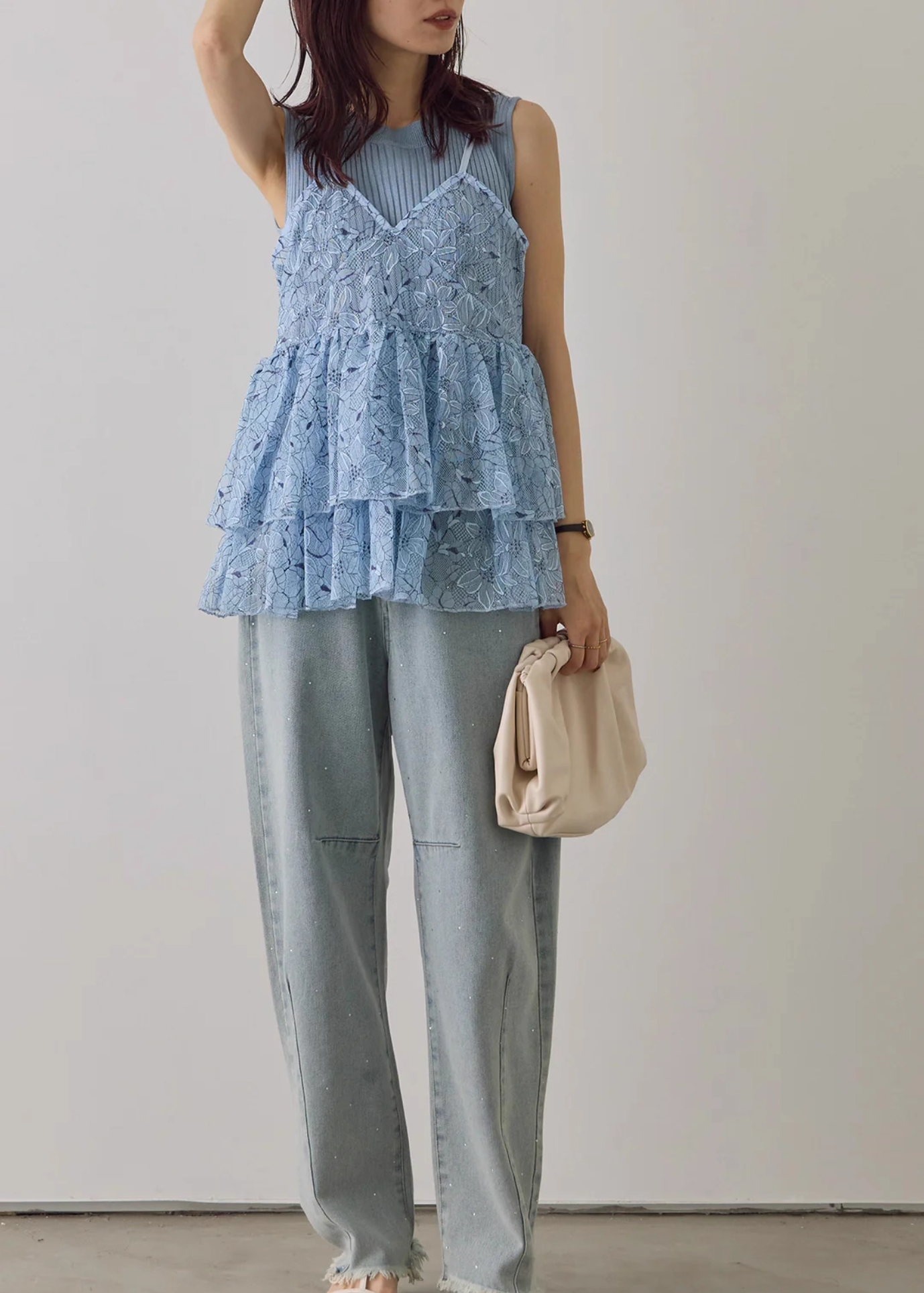 フェミニンなレースキャミと、ヘルシーなノースリーブリブニットのレイヤードセット。