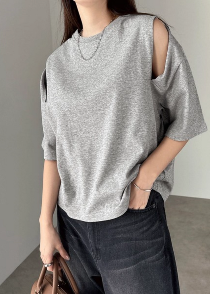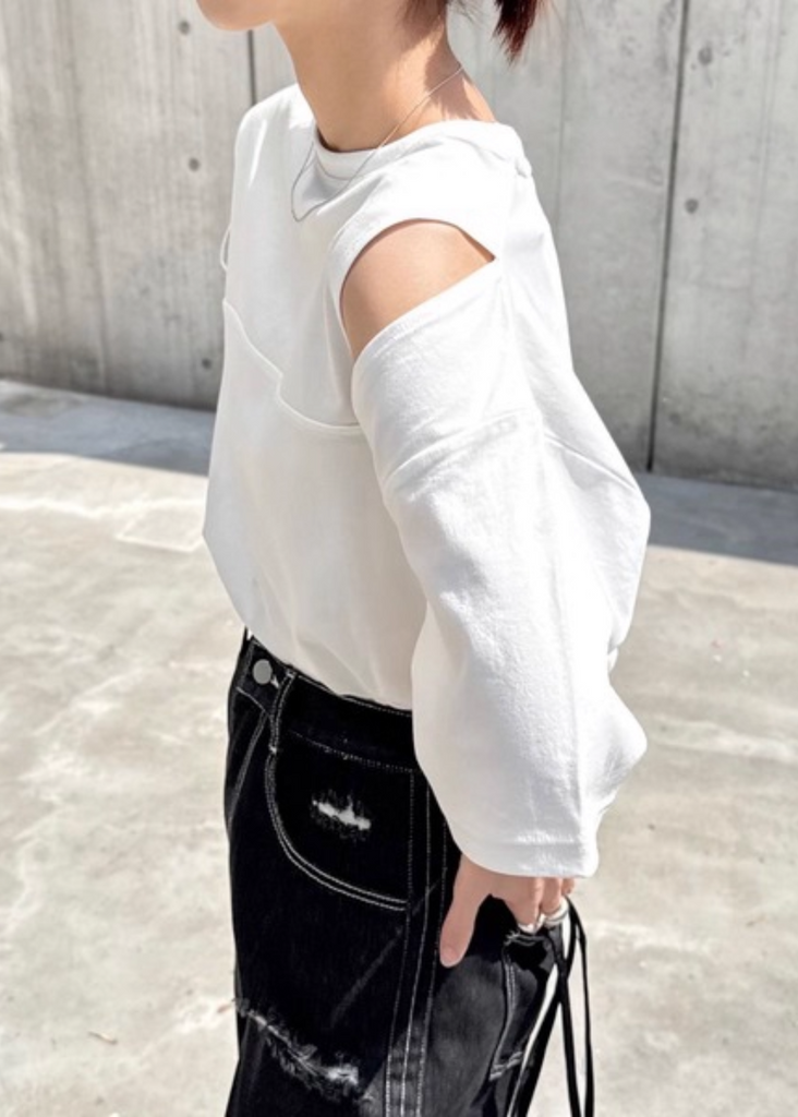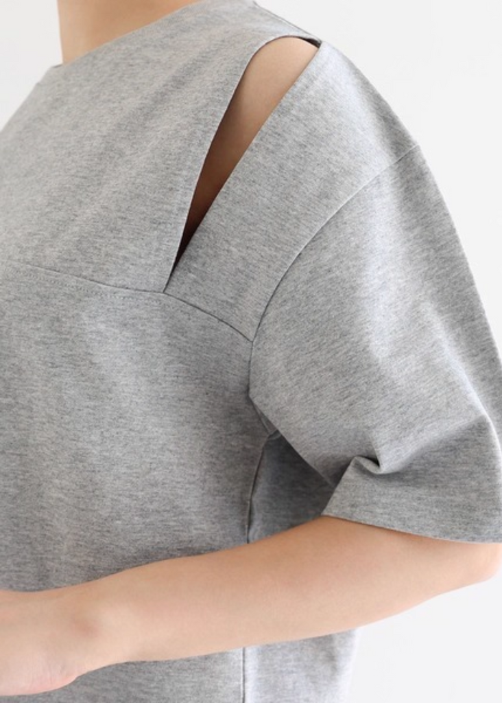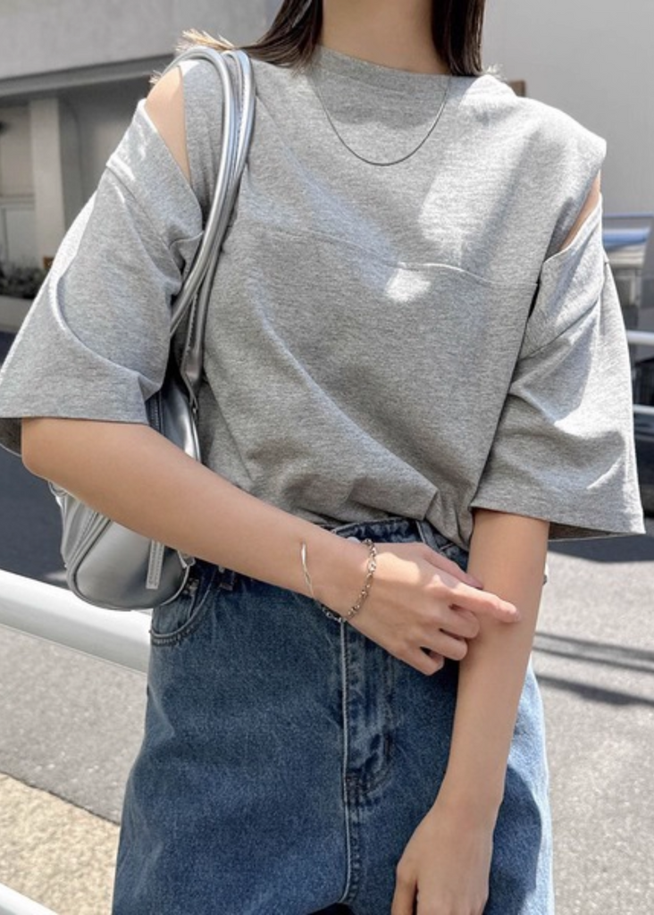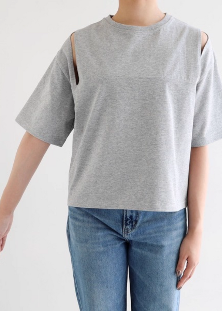 肩のスリットデザインが目を惹く、大人の抜け感漂うカットソー。